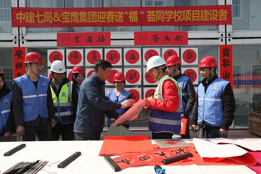 寶鷹集團常務副總裁古樸在致辭中說,中國優秀傳統文化源遠流長,在薈同學校這所國際化校園建設現場,為一線員工送“福”,是希冀通過以發揚老傳統的文化形式對辛勤奮戰在一線的勞動者表示敬意與慰問。同時感謝中建七局與招商地產對寶鷹集團的信任與支持,鼓勵每個寶鷹人要充分發揮“智敏勇”的企業文化精神,力保項目建設順利完成,為客戶遞交滿意答卷。