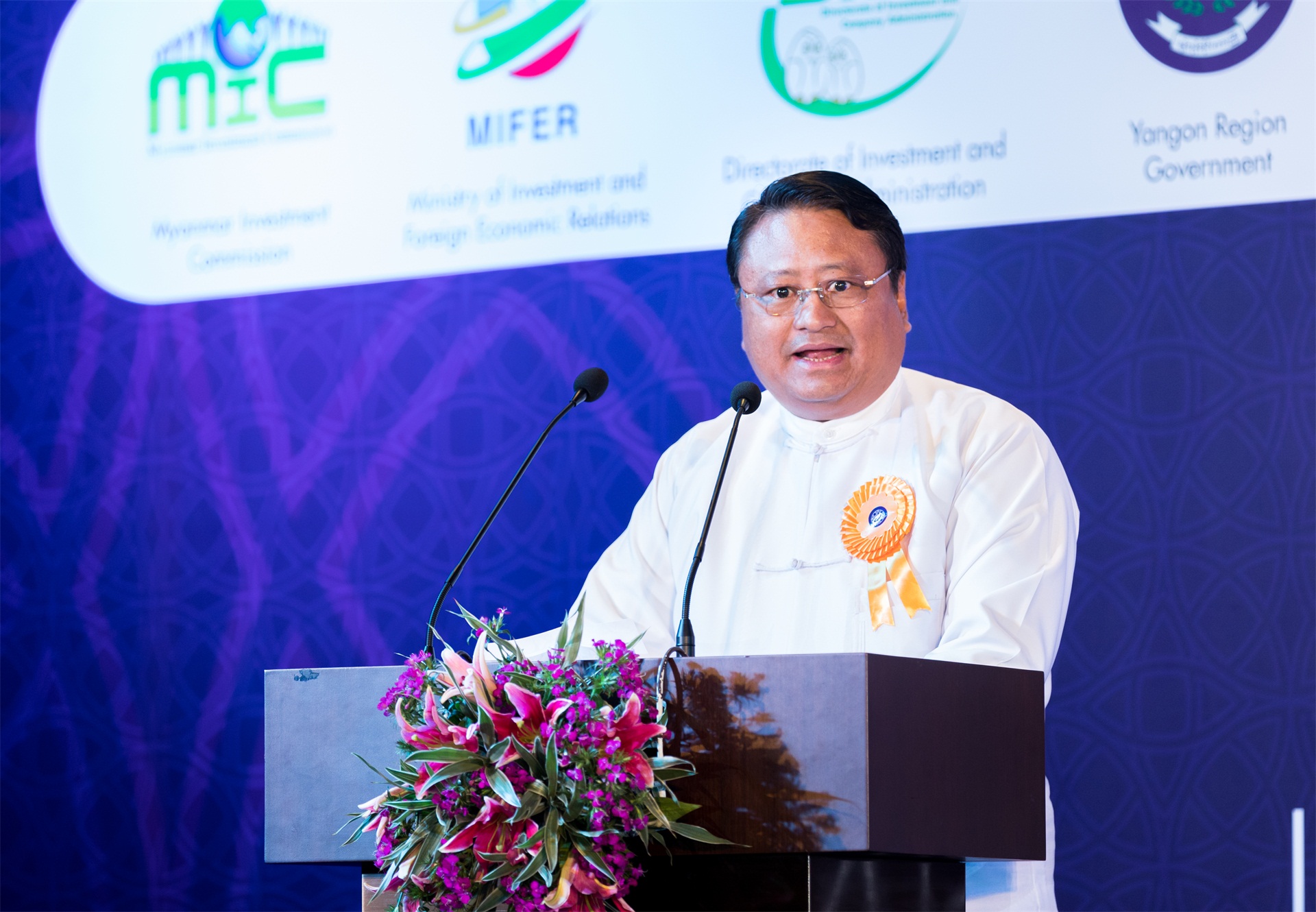▲ 緬甸仰光省政府省長吳漂敏登(U Phyo Min Thein)致辭并表示希望把仰光省打造成世界上最吸引外資來投資的中心地帶