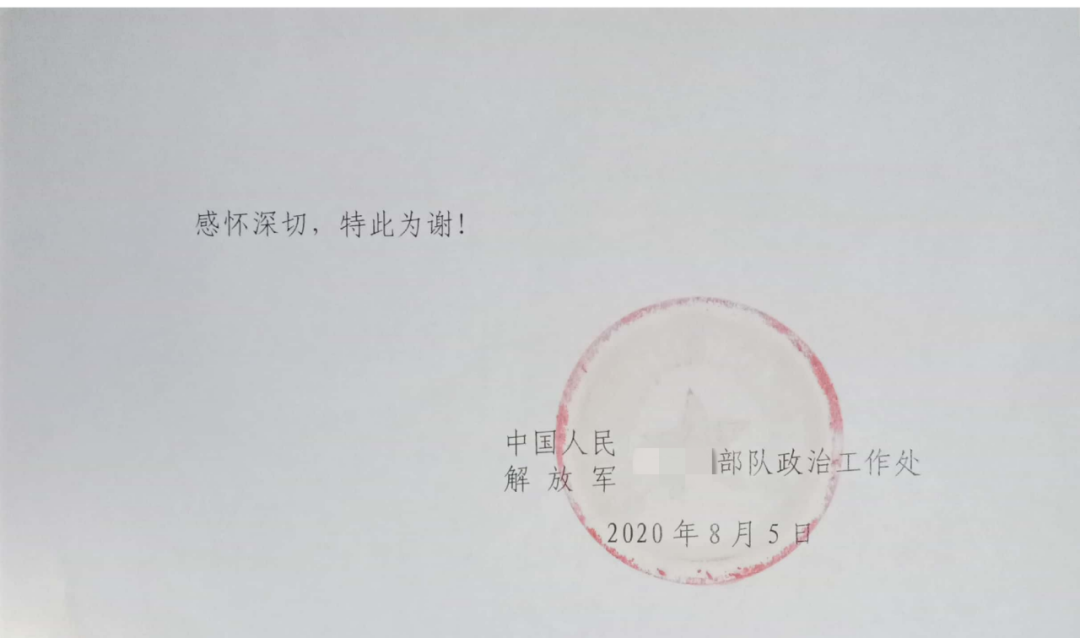 寶鷹集團的暖心行動得到了陳飛靈之子陳曉康所在部隊的高度肯定。其部隊發來的感謝函中提到,“這一舉動充分發揚了軍民團結一家親的‘雙擁’模范精神,積極展現了寶鷹集團負責擔當的企業形象” “你們以實際行動支持偉大的強軍事業,致力幫助員工家庭尤其是軍人家庭解決現實困難問題,為軍人免去后顧之憂”。