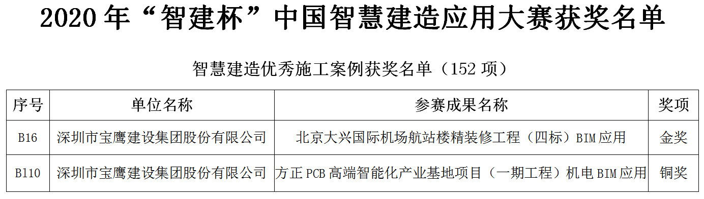 近日,繼獲得首屆建筑裝飾BIM大賽一等獎后,寶鷹集團BIM應用再獲兩項國家級BIM賽事大獎,其中,“北京大興國際機場航站樓精裝修工程(四標)BIM應用”榮獲2020年“智建杯”中國智慧建造應用大賽金獎、“方正PCB高端智能化產業基地項目(一期工程)機電BIM應用”榮獲2020年“智建杯”中國智慧建造應用大賽銅獎。