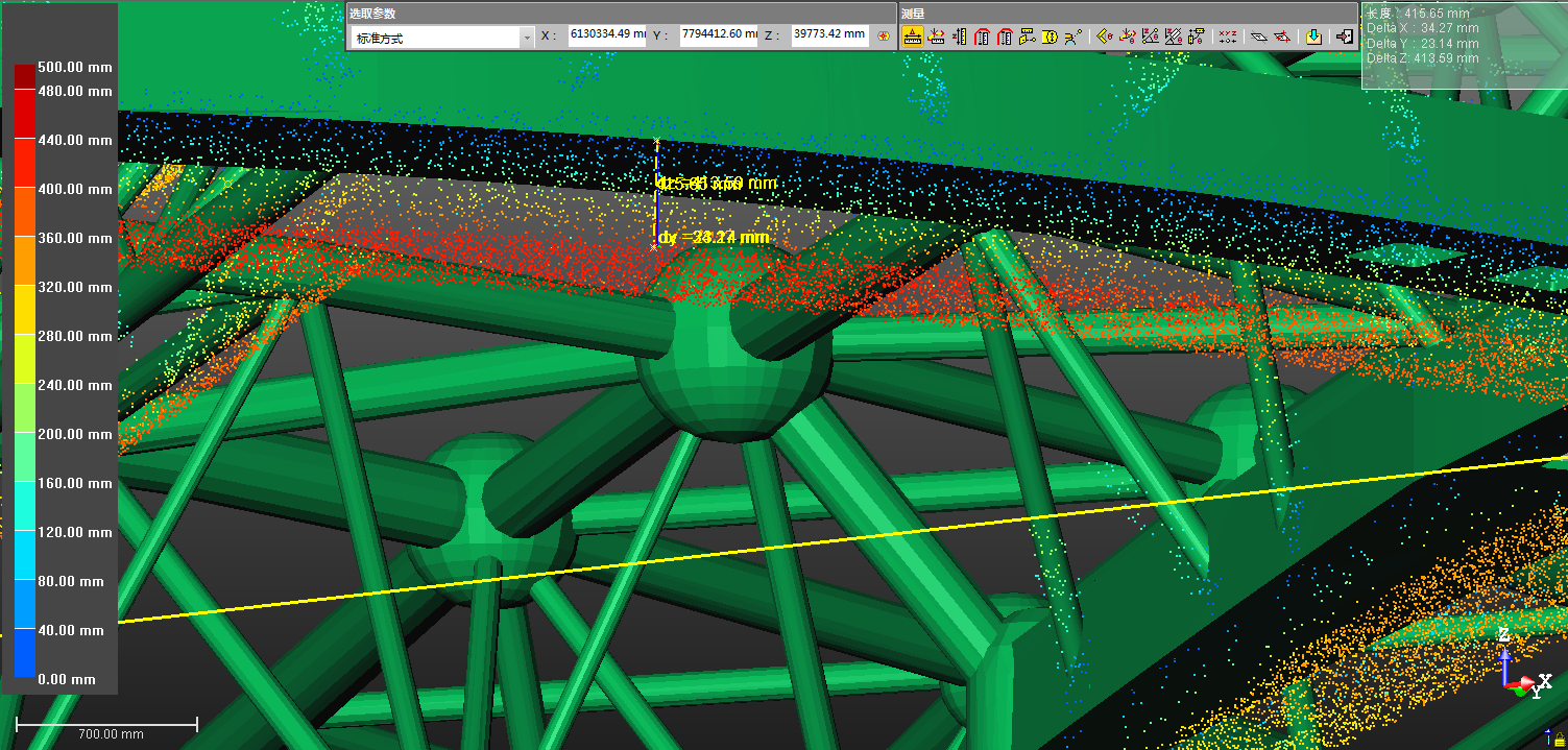 在設計階段,項目BIM團隊借助三維激光掃描儀精準快速采集現場數據,建立BIM三維模型;在施工階段,項目BIM團隊利用BIM數據模型進行施工模擬、力學分析,從BIM深化的模型中提取主次龍骨、面板、副框等相關加工圖,交付加工廠進行生產;同時,借助BIM參數化應用為現場提供安裝定位、加工切割、尺寸大小等各類數據,有效提高了施工人員對各種復雜部位的施工作業效率,明顯減少了材料二次加工浪費和返工等現象,為項目建設節省了大量成本,同時有效幫助施工進度控制。