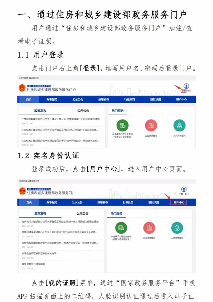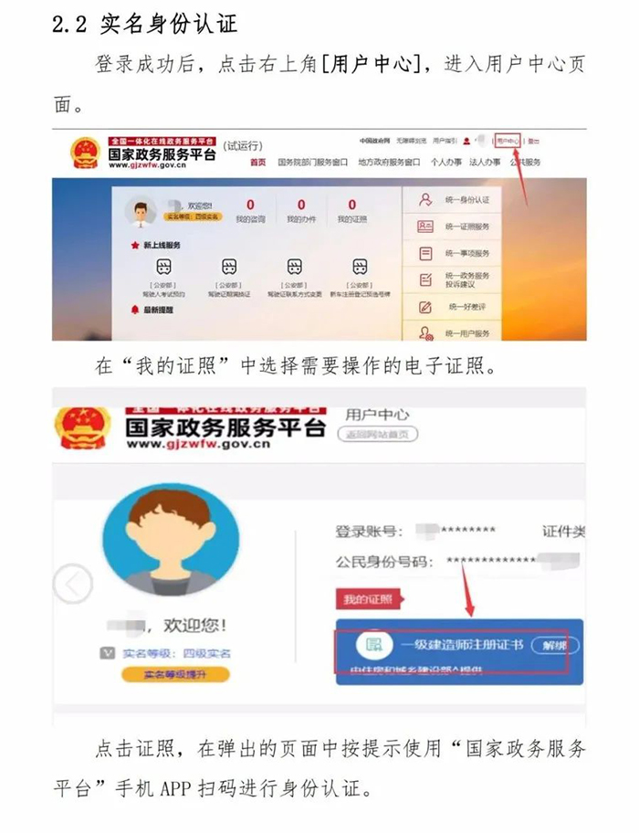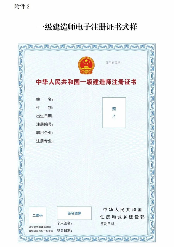 1.自2021年10月15日起在全國范圍內實行一級建造師電子證書(具體示例及說明見附件1),電子證書式樣按照《全國一體化在線政務服務平臺電子證照一級建造師注冊證書》標準執行(具體式樣見附件2)。自2022年1月1日起,一級建造師統一使用電子證書,紙質注冊證書作廢。