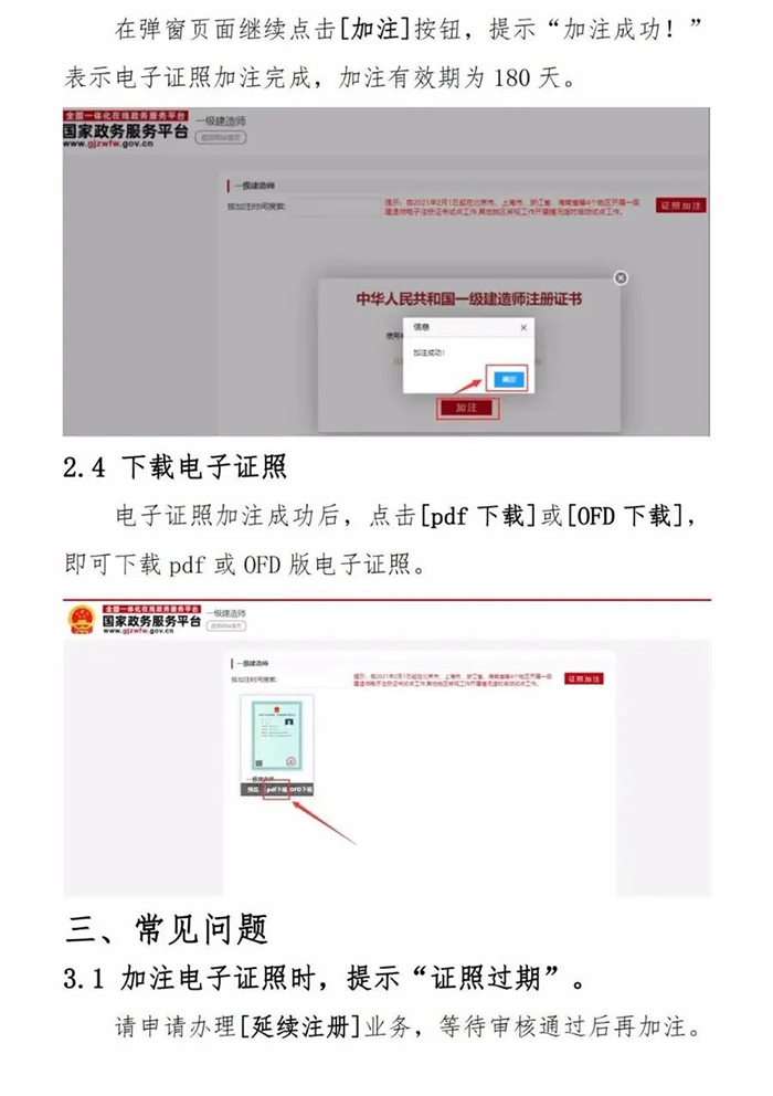 (一)一級建造師可登錄國家政務服務平臺、住房和城鄉建設部政務服務門戶查看和下載電子證書,具體操作流程可查閱《住房和城鄉建設部一級建造師電子證照申領和使用手冊》。查看和下載電子證書時,本人應確認該證書的使用時限。電子證書使用時限為180天,但使用時限距注冊專業有效期或建造師滿65周歲不足180天的,使用時限截止日期以注冊專業有效期截止日期或建造師滿65周歲當日為準。超出使用時限的電子證書無效,需重新下載電子證書并再次確認使用時限。