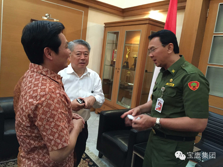 鐘萬學省長用流利的客家話對古少明主席一行的到來表示歡迎,并再次稱贊在昨天(5月31日)舉行的印尼慈濟醫院奠基儀式。古少明主席對鐘萬學省長百忙抽空接見表示深深的感謝,并向鐘省長匯報了寶鷹集團會在印尼投資發展基礎設施、智慧城市和智能家居建設以及互聯網電商等項目情況。鐘省長同時介紹了雅加達在交通、醫療、安防等領域打造智慧城市的規劃以及2018年在雅加達舉行的亞洲運動會場館建設籌備工作計劃等。鐘省長期待寶鷹集團在印尼大展身手,并指出政府會給予大力的支持。