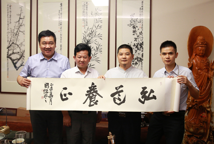 合影(左二為中國建筑裝飾協會總經濟師、中裝新網CEO朱時均,右二為寶鷹集團副總裁古樸,左一衛中裝新網副總編輯、《中華建筑報》深圳記者站站長仰光金,右一為寶鷹集團行政綜合部總經理梁淞)