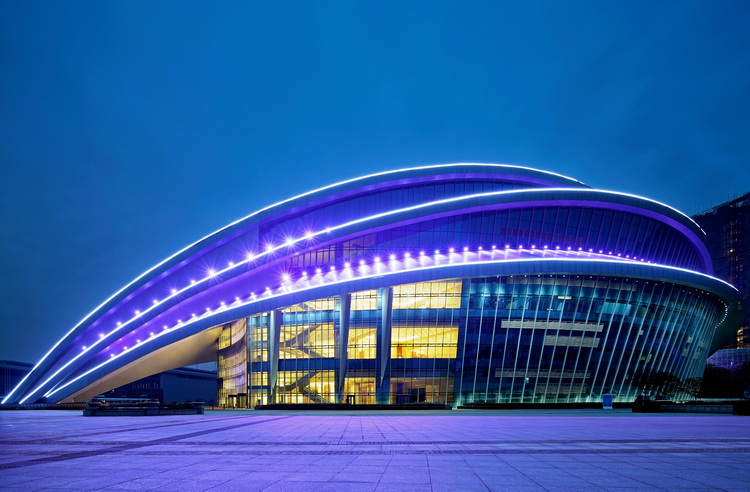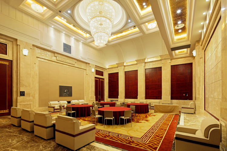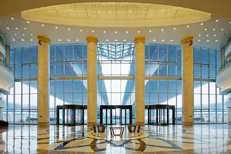 武漢國際博覽中心會議中心位于武漢國際博覽中心會展區和酒店區中間,為一座造型新穎、結構復雜、科技含量高的建筑。每個展廳長140米、寬72米,6個展廳連為一體,總面積達到6.5萬平方米,均為大跨度無柱展廳。即在6.5萬平方米、高20多米的房子中間,找不到一根柱子。這在國內極為罕見,焊接工藝誤差以毫米計。寶鷹集團承建了會議中心 1-5 層室內精裝修工程和室內外標識系統。本工程以國際水準的設計理念、高超精湛的施工工藝獲得了業主和社會的廣泛好評,曾獲得全國建筑工程裝飾獎(公共建筑裝飾類)、武漢市建筑工程“黃鶴獎”金獎和湖北省優質建筑裝飾工程“楚天杯”獎。