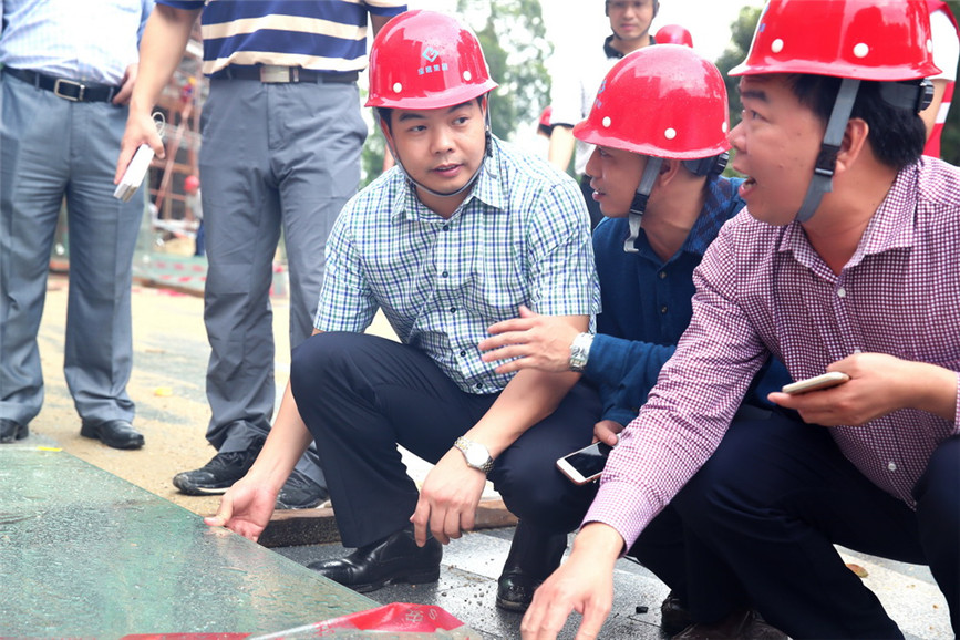 隨后,在寶鷹集團項目部工作人員的陪同下,雙方來到施工現場,就工程建設的進度問題仔細核對。在由寶鷹集團負責施工的裙樓展示區幕墻工程施工現場,古少波董事長及寶鷹集團眾高管就施工工藝、所用材料、項目施工難點等情況向項目部同事一一仔細詢問,并現場檢查安全施工事項,叮囑現場施工人員嚴把安全生產關。