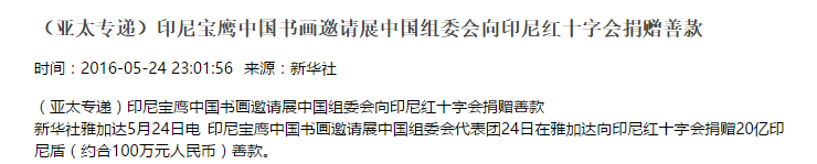 印尼紅十字會代表吉南加在捐贈儀式上說,代表印尼紅十字會向印尼寶鷹中國書畫邀請展中國組委會表示感謝,印尼紅十字會是和印尼共和國歷史一樣長的社會組織,在克服自然災害方面做了很多工作,舉辦了各種有利于社會健康的事業。作為世界紅十字會組織的成員,印尼紅十字會既會接受其他組織的捐贈,也會主動向需要幫助的國家伸出援手,為整個社會服務。