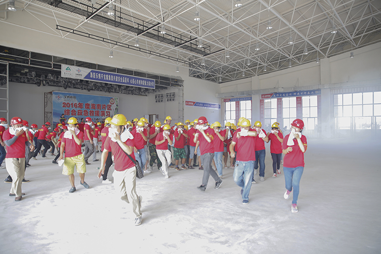 演習(xí)項(xiàng)目分為防臺(tái)風(fēng)演習(xí)、防雨汛演習(xí)、消防疏散演習(xí)三個(gè)大項(xiàng),分別模擬了觸電、中暑、火災(zāi)、暴雨臺(tái)風(fēng)等工地常見(jiàn)的突發(fā)安全事件和海南當(dāng)?shù)爻0l(fā)的自然氣象災(zāi)害。在觸電事件發(fā)生后,演練人員封鎖事件現(xiàn)場(chǎng)、撥打120急救熱線(xiàn)、按照正確的自救方法對(duì)傷員進(jìn)行救治,迅速報(bào)告項(xiàng)目安全人員,同時(shí)等待專(zhuān)業(yè)救助人員前來(lái)救治。在火災(zāi)發(fā)生后,現(xiàn)場(chǎng)濃煙密布,演練人員迅速自發(fā)分為三隊(duì)從安全通道有秩序地撤離現(xiàn)場(chǎng)。暴雨、中暑等演練亦遵循各自的特點(diǎn),在模擬實(shí)戰(zhàn)中為觀(guān)摩人員獻(xiàn)上豐富的一課。在滅火演練中,寶鷹集團(tuán)總裁成湘文上陣為觀(guān)摩者示范了消防設(shè)備的使用方法。