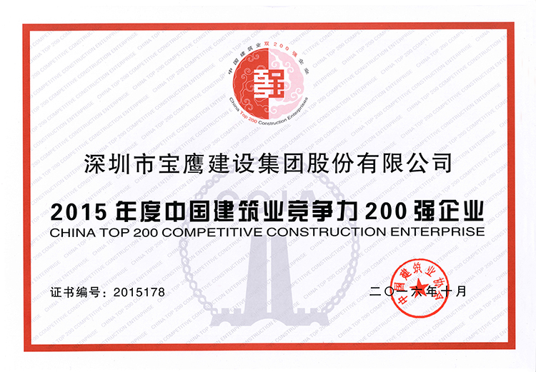 自2016年起,中國建筑行業協會將“中國建筑業雙百強企業評價”調整為“中國建筑業雙200強企業評價”(包括中國建筑業競爭力200強企業評價和中國建筑業成長性200強企業評價)。本次評選,寶鷹集團在來自全國28個省、自治區、直轄市建筑業協會和16家行業建設協會以及中建總公司、中國建筑股份有限公司、中國新興總公司推薦的313家企業中成功突圍,榮膺“2015年度中國建筑業競爭力200強”榜單。